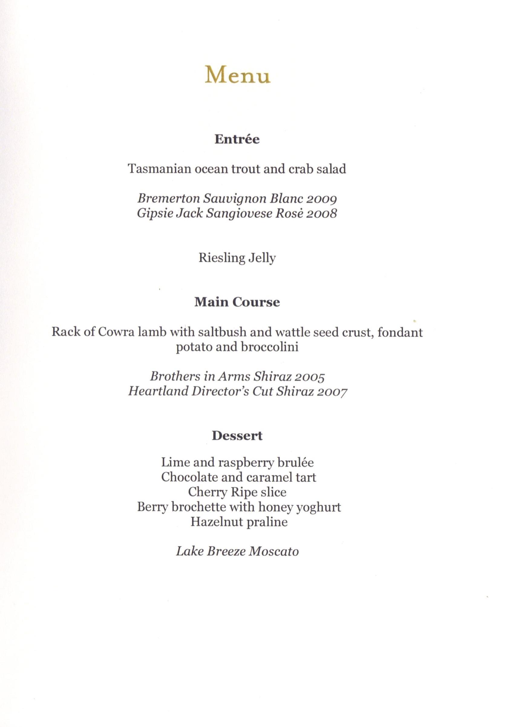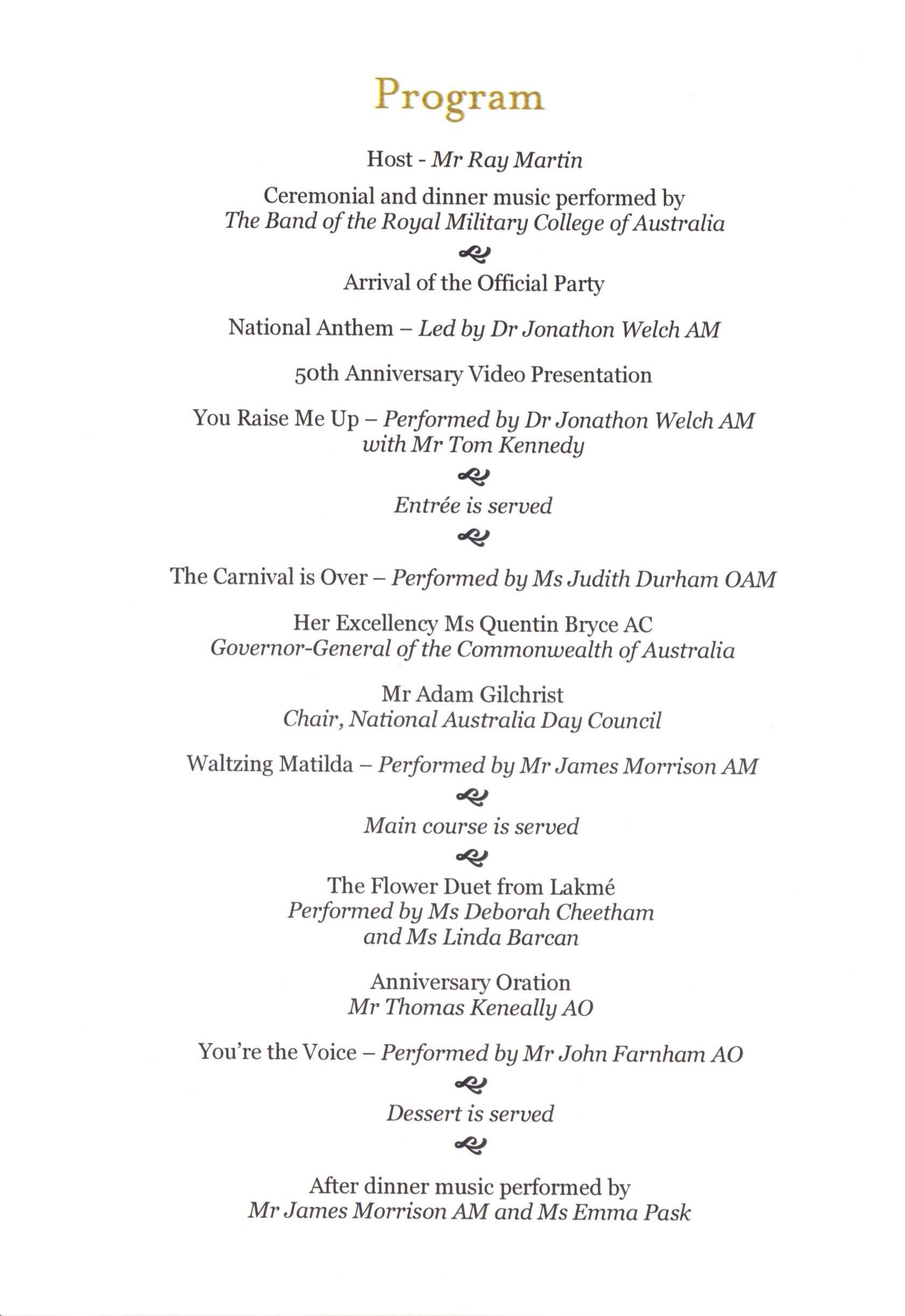 A fanfare played and we rose from our seats. The Governor-General Quentin Bryce made her entrance in a dazzling hot pink suit. Ray Martin kicked off proceedings, there was a rousing rendition of the National Anthem and away we went…